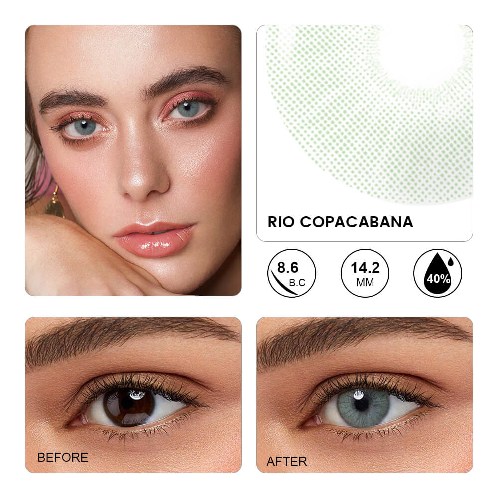 Rio Copacabana Green Contacts redefine natural beauty with their striking green hue and intricate design. Unlike standard natural contacts that offer minimal coverage, Rio Copacabana features a unique pattern that seamlessly integrates with your own eye color.