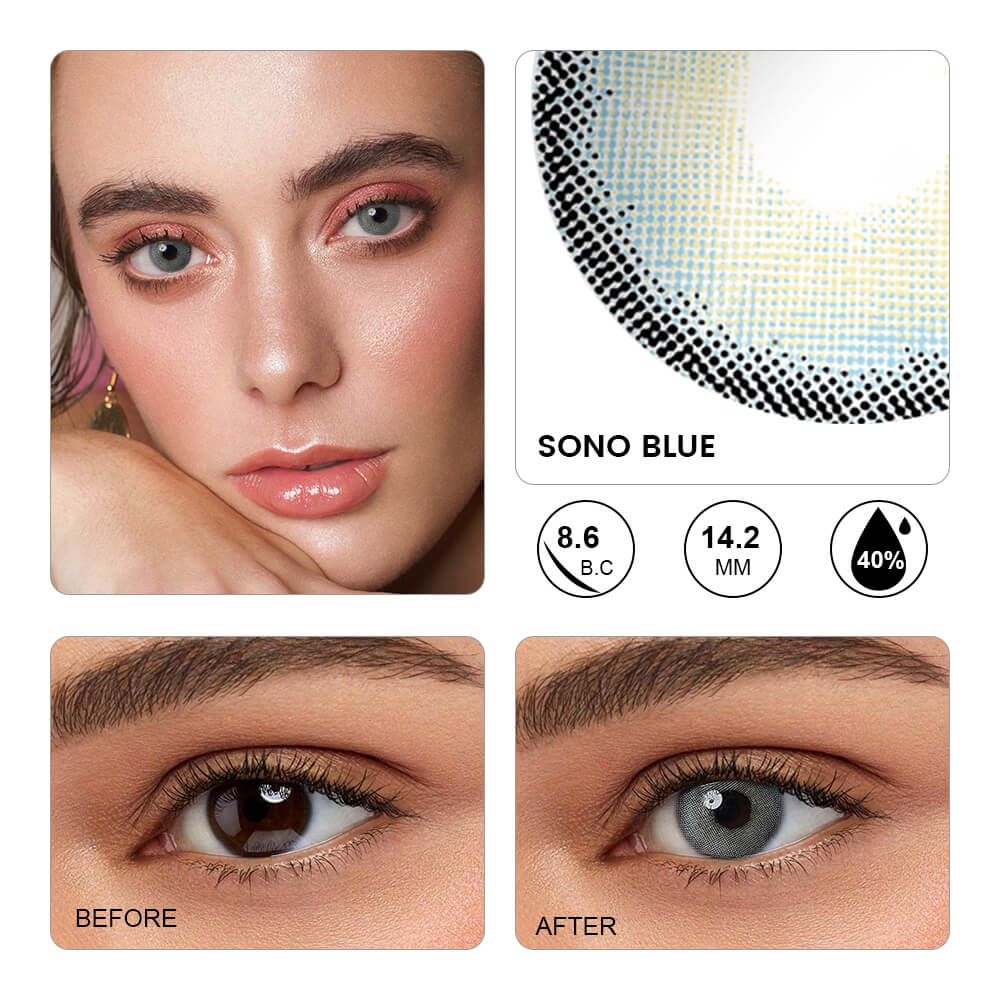 Perfect for both light and dark eyes, SONO Blue Eyes lenses provide exceptional coverage and seamless blending, ensuring a stunning transformation. Whether you're looking to add a touch of enchantment to your everyday look or complete a dramatic style for special occasions, these lenses deliver an alluring and fantastical appearance. Embrace the magic of SONO Blue and let your eyes shine with captivating allure.